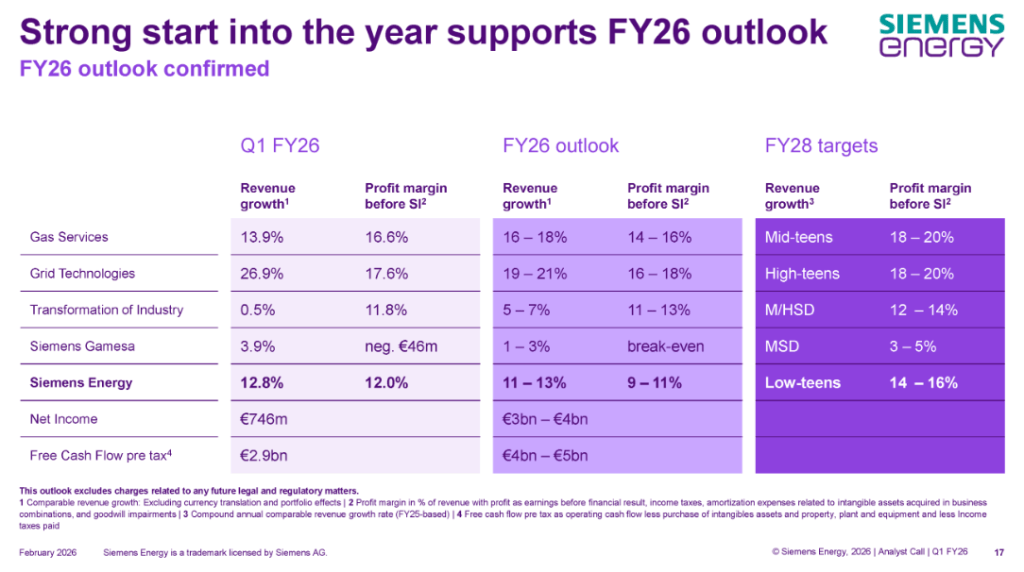 2025财年(截至去年12月底),GE Vernova的积压订单达到1500亿美元的历史高位,2025年订单额达593亿美元,同比增长34%。电力业务订单额达到328亿美元,同比增长52%,该板块EBITDA利润率增长220个基点。其中第四财季签署了24GW燃气轮机订单,“客户正在通过付费预订未来产能,显示出极其强劲的市场需求。”该公司将2026财年营收指引上调至440亿-450 亿美元,调整后EBITDA 利润率为11%-13%。同时上调2028年财务预期。